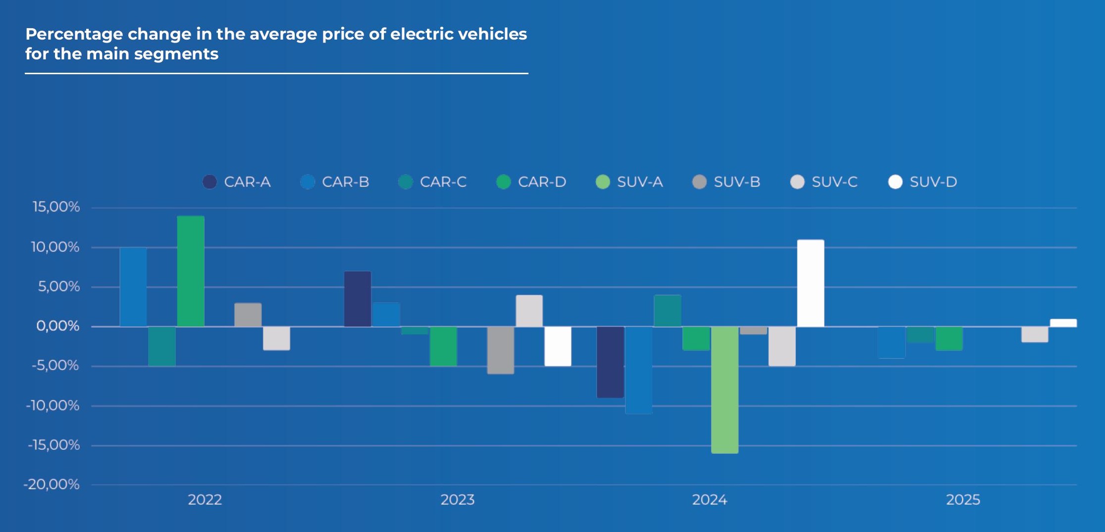 La tendenza è confermata dai dati sull’evoluzione del prezzo medio dei veicoli BEV nei principali segmenti europei, che mostrano una riduzione costante negli ultimi quattro anni, con un calo particolarmente marcato nel 2024. Questo andamento evidenzia un avvicinamento progressivo ai livelli di prezzo delle controparti ICE. In alcuni segmenti, come quello premium e nei SUV di segmento C, i veicoli elettrici risultano già oggi altamente competitivi; mentre nel segmento B — il più rilevante in mercati come Italia e Francia — si osserva dal 2024 una fase di decrescita sostenuta dei prezzi, destinata a proseguire anche nel prossimo futuro.